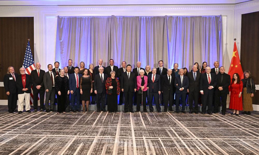 当地时间11月15日晚,国家主席习近平在美国旧金山出席美国友好团体联合举行的欢迎宴会。这是宴会开始前,习近平会见飞虎队和史迪威将军后人、鼓岭、艾奥瓦州、华盛顿州等方面友好人士代表,同他们亲切交谈并合影留念。新华社记者 谢环驰 摄
