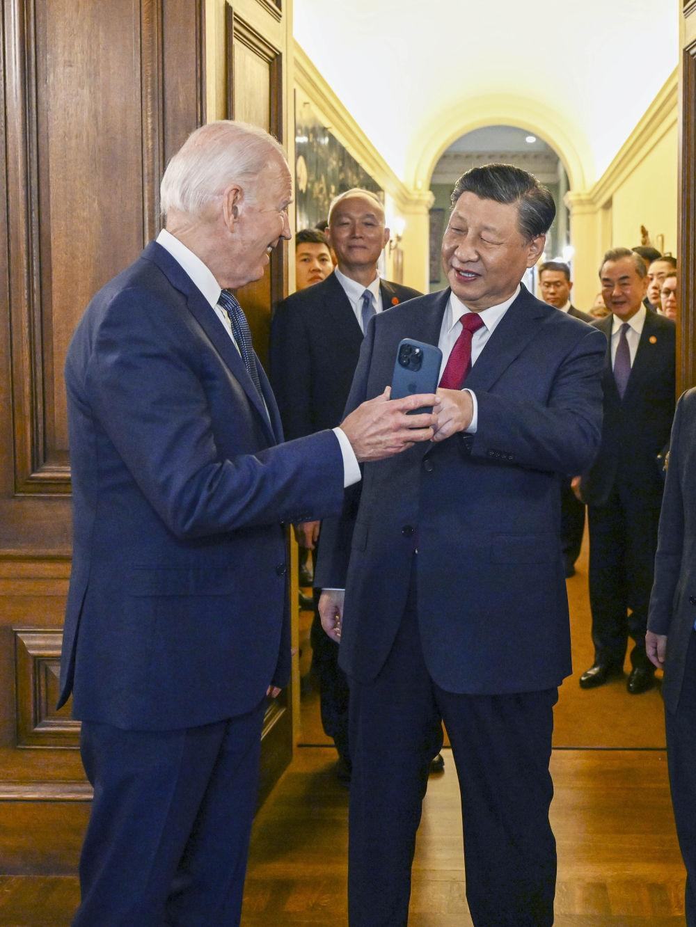 当地时间11月15日中午,美国旧金山郊外的斐洛里庄园,习近平主席结束同美国总统拜登的晤谈,出席拜登总统举行的宴会。这是拜登在手机上展示1985年习近平在担任正定县委书记时访问旧金山的一张照片。新华社记者 李学仁 摄