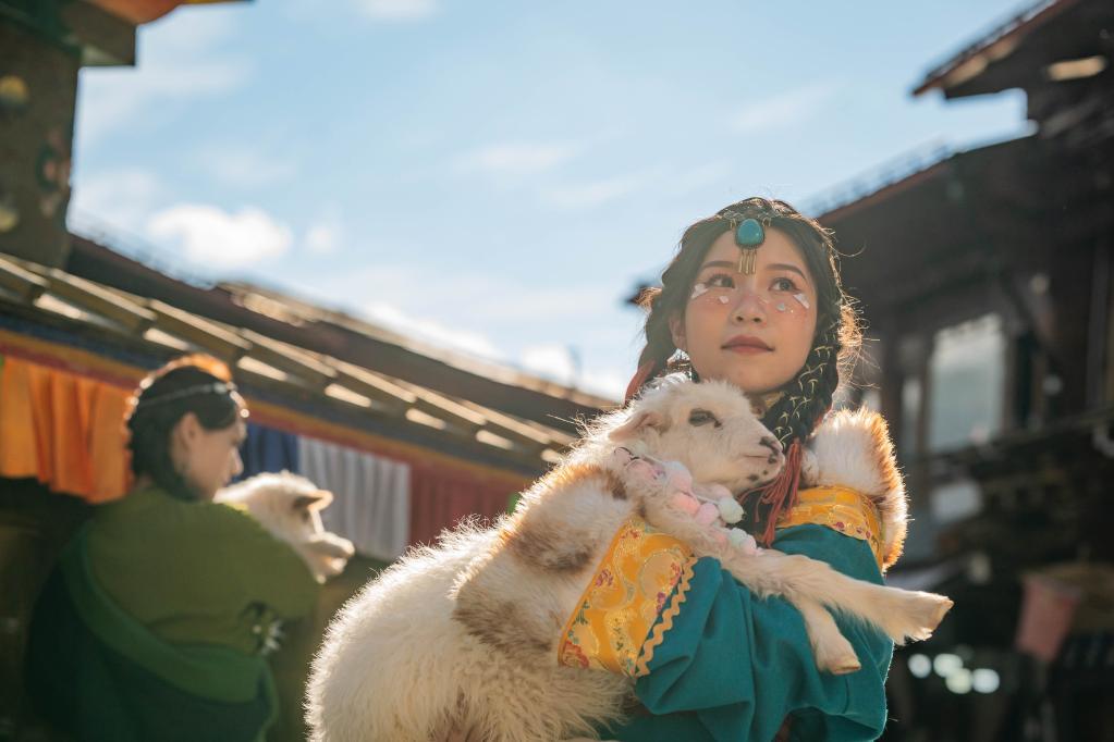 香格里拉哈巴雪山下,游人和牦牛合影。