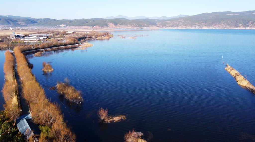 黑颈鹤和水鸟在纳帕海自然保护区栖息。