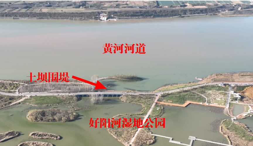 记者看到,这条近20米长的土坝,拦在黄河河道与好阳河湿地公园之间,阻断了好阳河汇入黄河的通道。