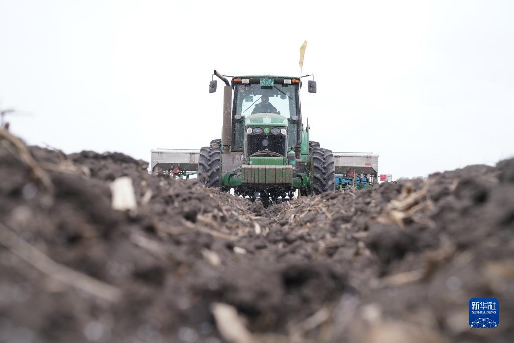 2023年4月12日,在黑龙江省北安市的北大荒集团建设农场有限公司一处农田中,许志国驾驶大型拖拉机进行分层定量施肥作业。 新华社记者 王松 摄