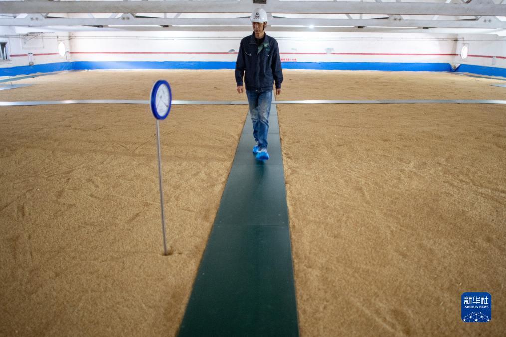 2023年11月14日,在中储粮仙桃直属库有限公司,工作人员在仓房内巡视检查。 新华社发(杜子璇摄)