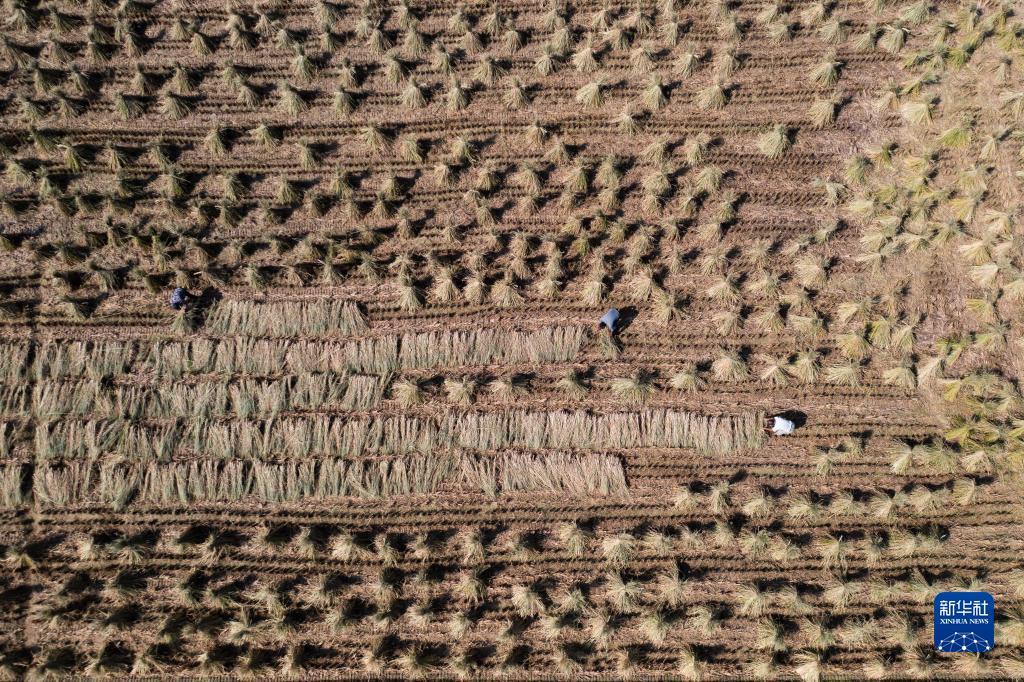种植户在杭州市富阳区渔山乡粮食生产功能区的稻田内捆扎秸秆(2022年10月19日摄,无人机照片)。 新华社记者 徐昱 摄