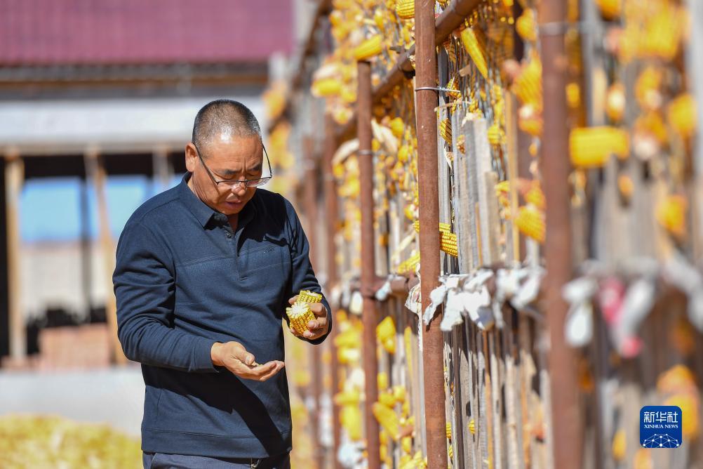在吉林省公主岭市友忠种植农民专业合作社,理事长孙友忠查看科学储粮仓中的玉米储存情况(2023年10月19日摄)。 新华社记者 张楠 摄