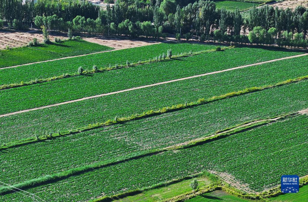 这是2023年8月29日拍摄的内蒙古巴彦淖尔市临河区狼山镇光明村农业示范园区内麦后复种的燕麦草(无人机照片)。 新华社记者 李云平 摄
