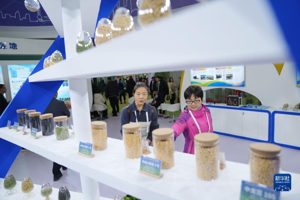 2023年11月15日,在首届中国(黑龙江)国际绿色食品和全国大豆产业博览会的黑龙江省农业科学院展区,参会者在了解豆种情况。 新华社记者 王建威 摄