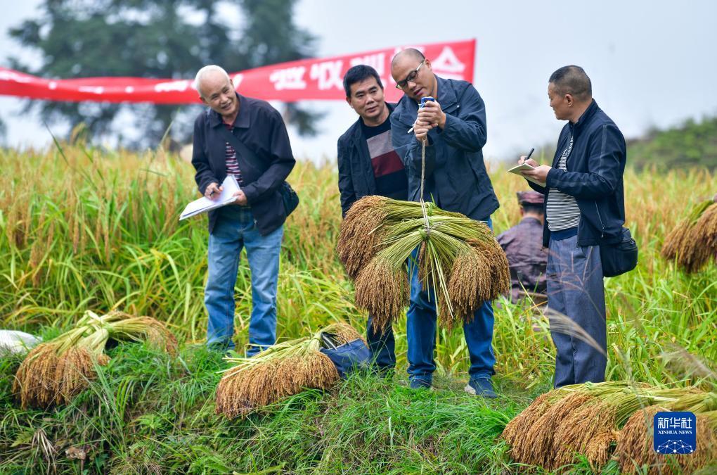 2023年10月11日,农技人员在贵州省从江县高增乡建华村现场测产香禾糯稻谷。 新华社记者 杨文斌 摄