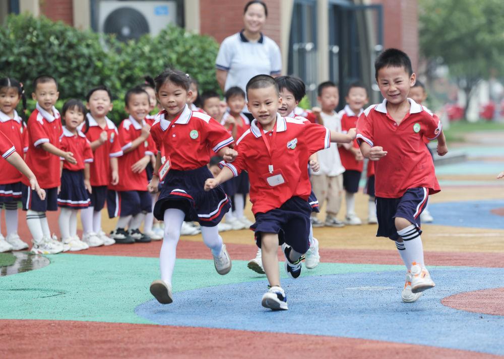 2024年9月26日,孩子们在浙江省湖州市长兴县开发区中心幼儿园参加趣味追逐游戏。新华社记者 徐昱 摄