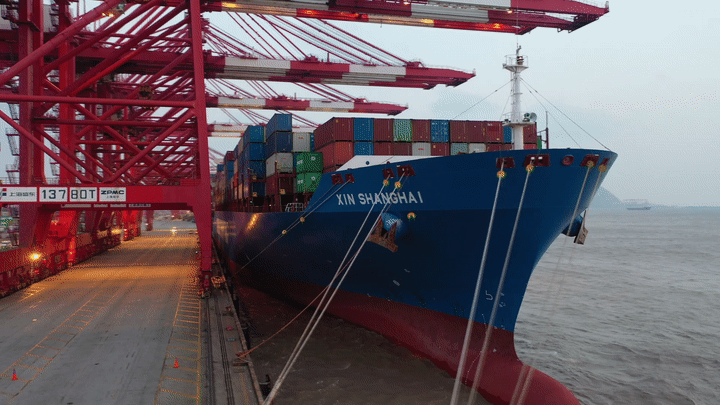12月18日,“新上海”轮正在靠泊上海洋山港码头(无人机照片)。新华社记者方喆摄