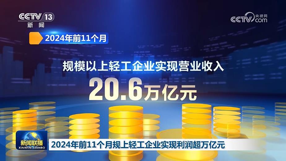 记者从中国轻工业联合会获悉,2024年前11个月,中国轻工行业生产平稳增长,规模以上轻工企业实现利润超万亿元。