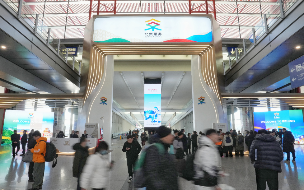 图为2025年1月8日,在北京首都国际机场T3航站楼拍摄的“北京服务”机场服务点。从1月1日起,北京在首都国际机场和大兴国际机场的国际到达出口设立“北京服务”机场服务点,为来华、来京外籍人士提供金融、通讯、交通、文旅等四个主题的20余项高频服务,便利八方来客畅游中国。新华社发 (鞠焕宗摄)