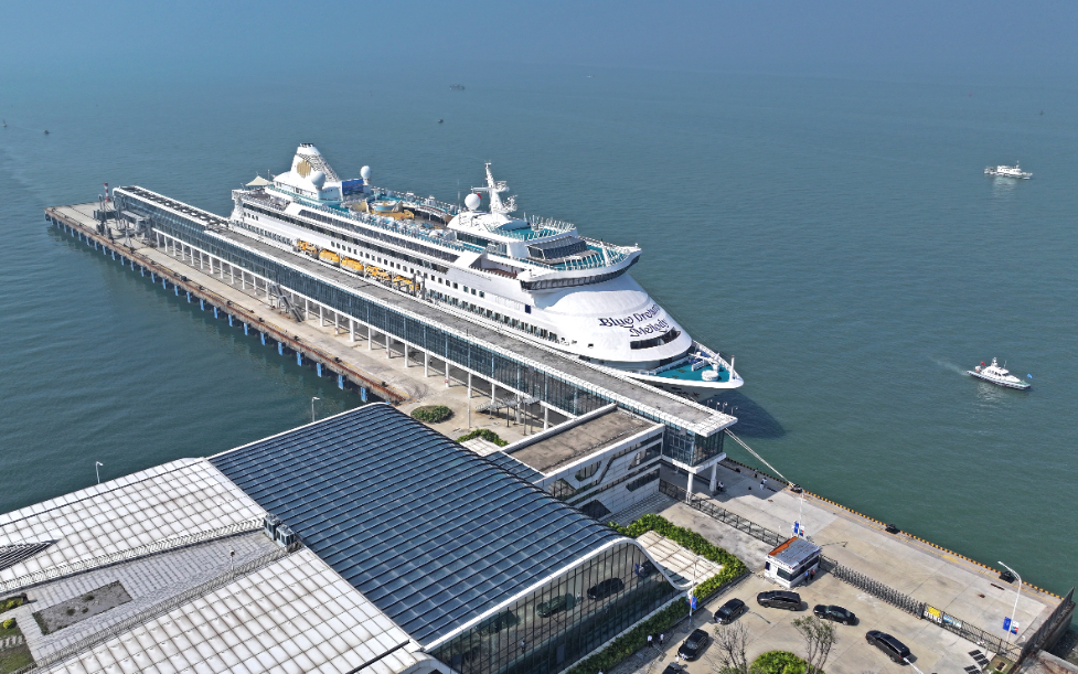 图为2024年11月15日在北部湾国际邮轮母港拍摄的即将执行首航任务的“蓝梦之歌”号邮轮。新华社发(无人机照片,周华摄)。