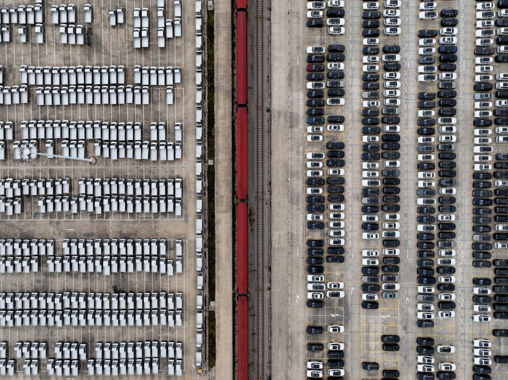 这是在中铁联集武汉中心站拍摄的整装待发的汽车(2024年11月16日摄,无人机照片)。新华社记者 邢广利 摄