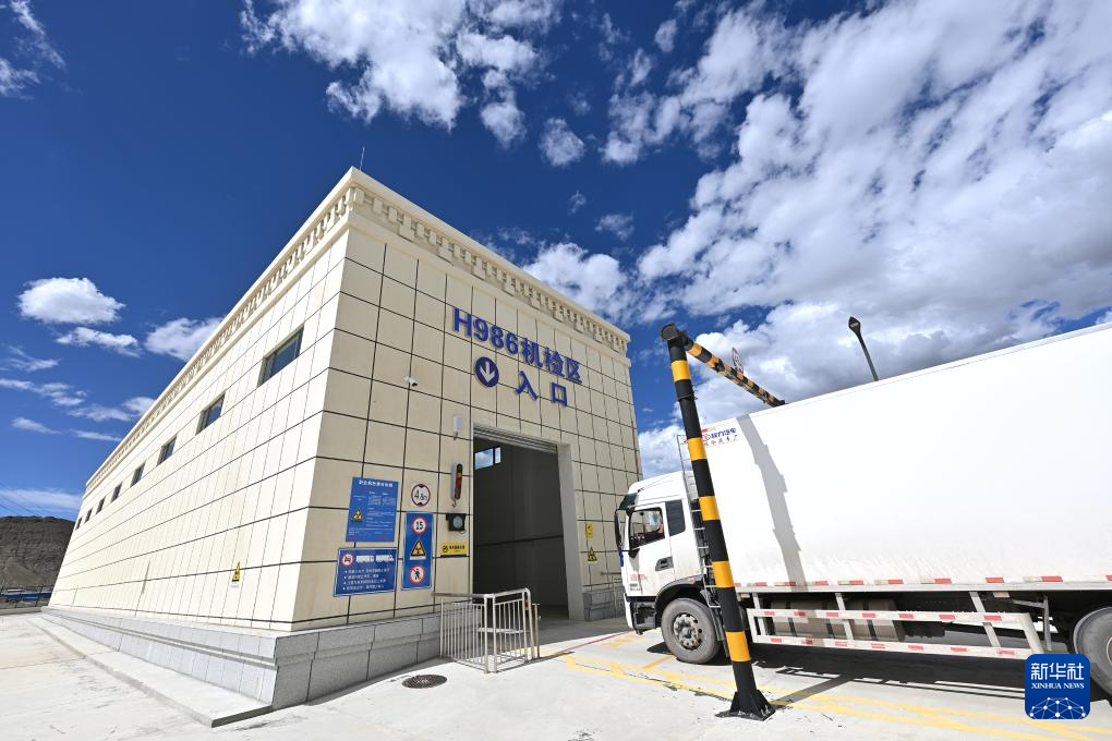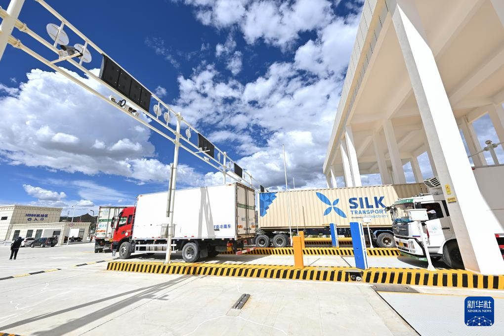 7月16日,货车通过日喀则国际陆地港出口货物查验场卡口。新华社记者 李鑫 摄
