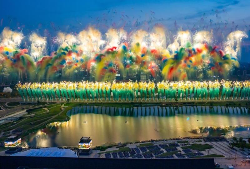 8月7日拍摄的开幕式上的焰火表演。当日,第12届世界运动会开幕式在成都举行。新华社记者 孙非 摄