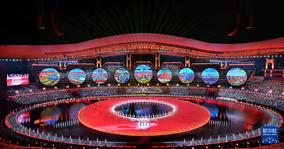 以《圆梦未来》为主题的文体展演拉开序幕。整个演出由“同根同源”“同心同缘”“同梦同圆”3个篇章组成,创新运用体育元素、艺术手段和前沿科技,生动诠释了本届全运会“激情全运会,活力大湾区”的主题。