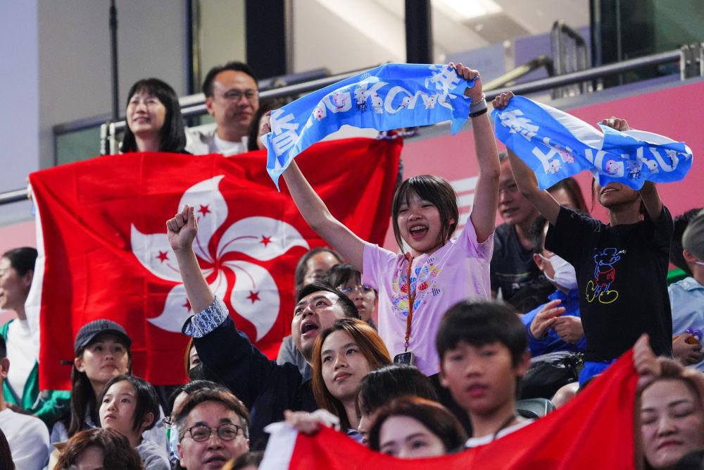 11月16日,观众在现场为香港队选手张家朗加油。当日,在香港举行的第十五届全国运动会击剑男子花剑个人铜牌赛中,香港队选手张家朗15比2战胜个人选手曾昭然,获得季军。新华社记者 朱炜 摄