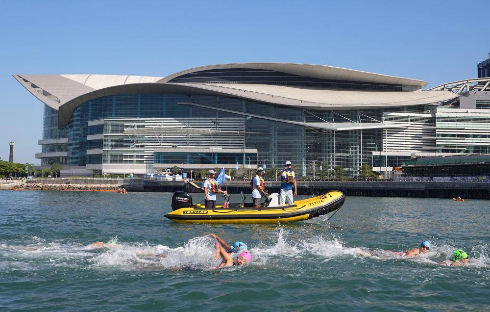 11月16日,参赛选手在游泳比赛中。当日,在香港举行的第十五届全国运动会铁人三项混合接力决赛中,山东队获得冠军,香港队获得亚军,中国公安体育协会队获得季军。新华社发(吕小炜摄)
