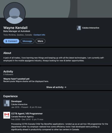 Wayne的领英个人资料显示,他曾于2009年2月至2014年12月期间在税务局工作。他在个人资料中称,除了负责CCB的申请处理外,Wayne还担任过Visual Basic程序员。“由于雇主意识到我开发的一些提效工具使我们在生产力方面明显领先于加拿大的其他税务中心,我最终成为了该部门的临时VB程序员,”他在个人资料中说道。