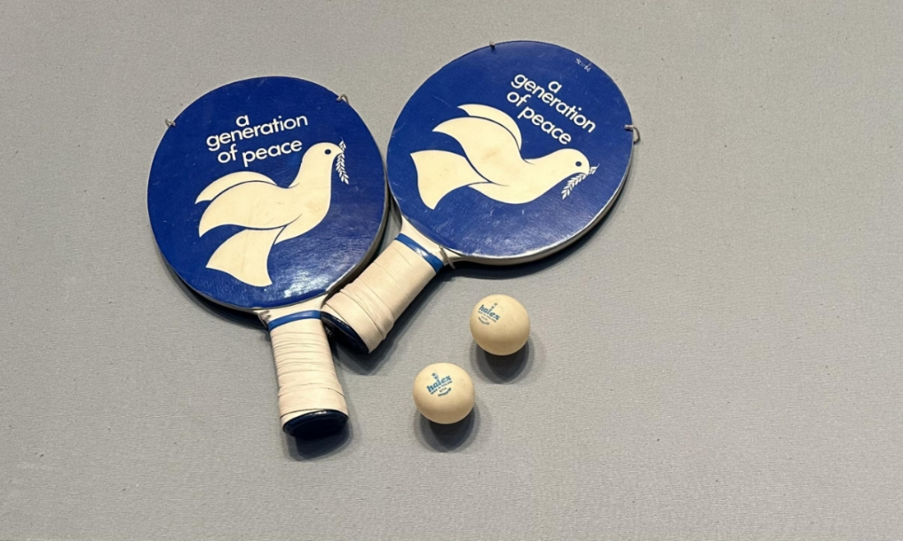 1972年2月,美国底特律商界代表向中方赠送一副乒乓球拍,表达对两国开启民间外交的支持。蓝底白字的球拍上,一只白鸽衔着橄榄枝展翅飞翔,上面用英文写着“和平一代”。两个月后,在全美瞩目下,中国乒乓球代表团抵达底特律。底特律民众为远道而来的中国运动员亮出欢迎标语牌,其中一块书写着“了解、友谊、和平”。