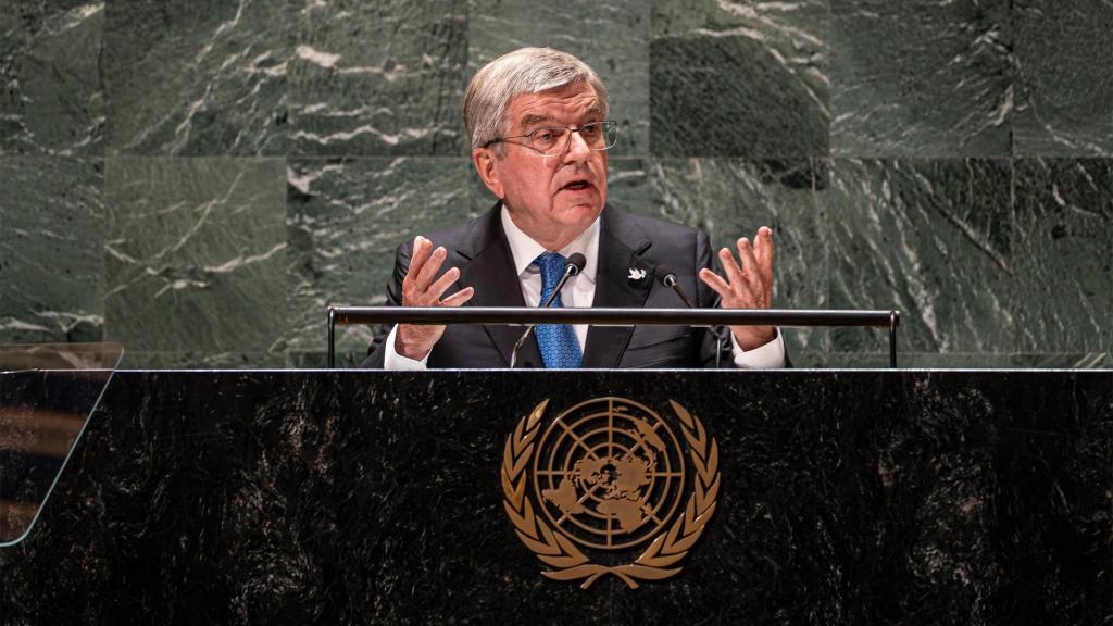 11月21日,国际奥委会主席巴赫在第78届联合国大会上发表演讲。图片来自国际奥委会官方网站