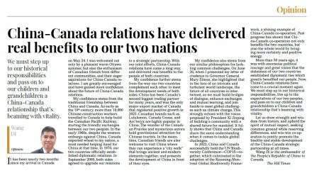 中国驻加拿大大使王镝在加主流媒体《国会山时报》发表署名文章