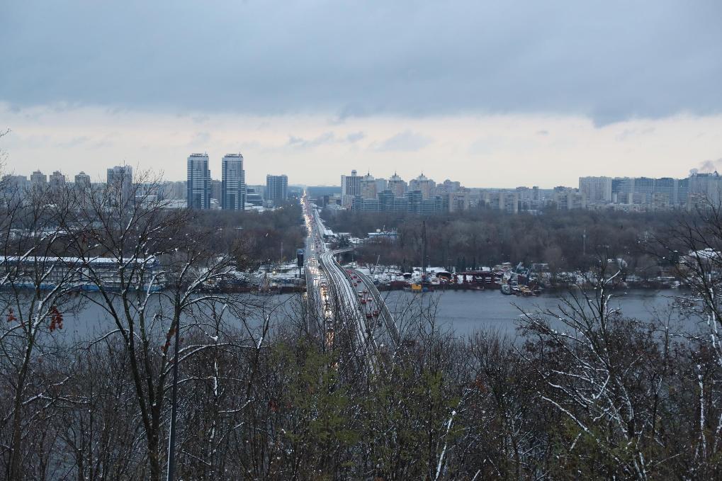 这是11月21日在乌克兰首都基辅拍摄的白雪映衬下的地铁桥和第聂伯河。当日,乌克兰首都基辅迎来今冬初雪。新华社记者李东旭摄