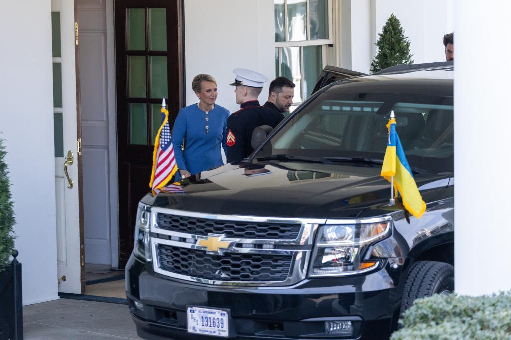 2月28日,乌克兰总统泽连斯基(左三)离开美国华盛顿白宫。(新华社记者胡友松摄)