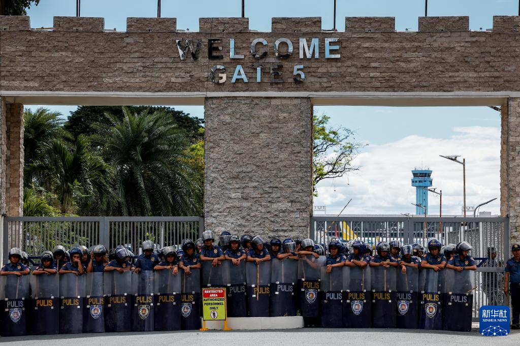 3月11日,在菲律宾大马尼拉地区的帕赛,警察在菲前总统杜特尔特被拘留地外执勤。新华社发