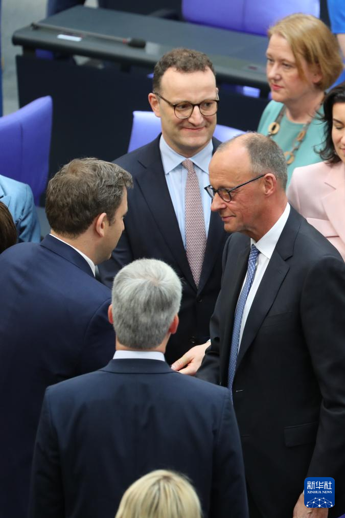 5月6日,在德国首都柏林的国会大厦,默茨(右)在第二轮投票议程中。新华社记者 杜哲宇 摄