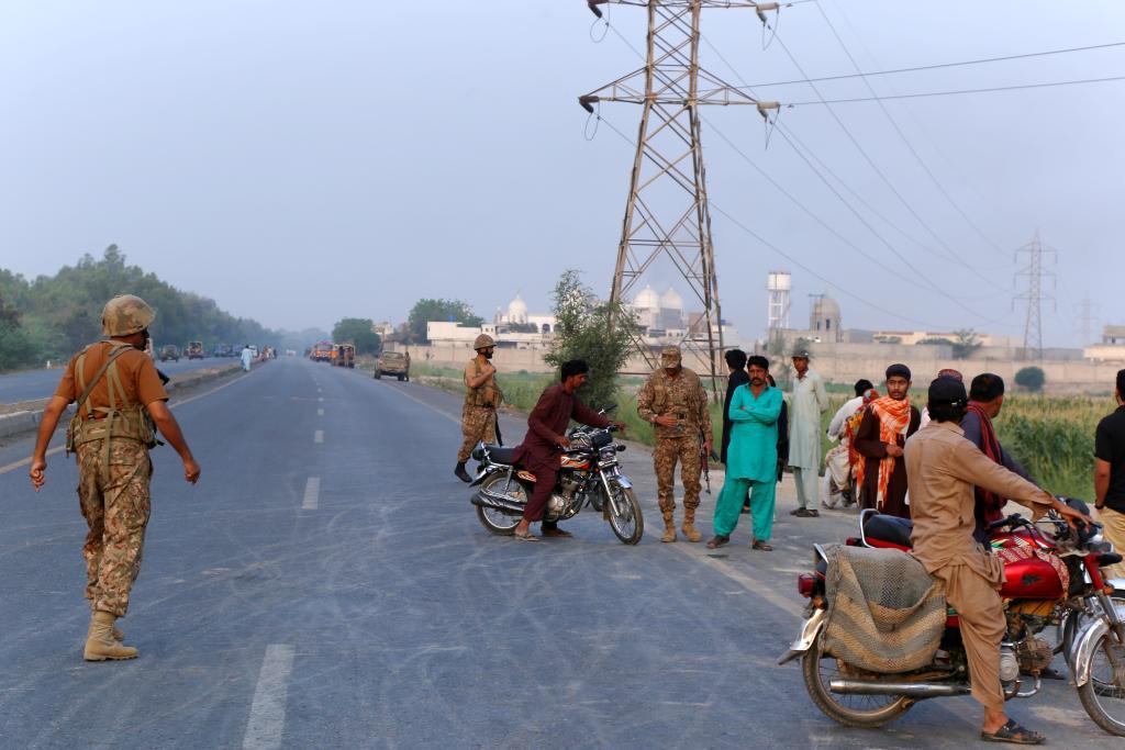 2025年5月7日,在遭受印度导弹袭击的巴基斯坦东部旁遮普省巴哈瓦尔布尔地区,军人封锁了当地道路。新华社发(曼苏尔·阿巴斯摄)