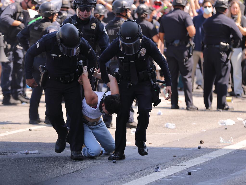 6月8日,在美国加利福尼亚州洛杉矶市中心的联邦执法机构门前,一名抗议者被警察控制。新华社发(邱晨摄)