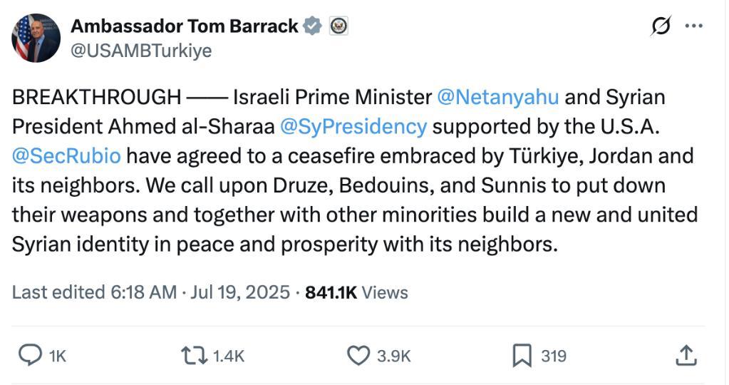 美国驻土耳其大使兼叙利亚问题特使汤姆·巴拉克社交媒体帖文截图。