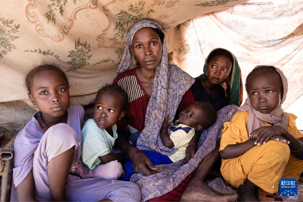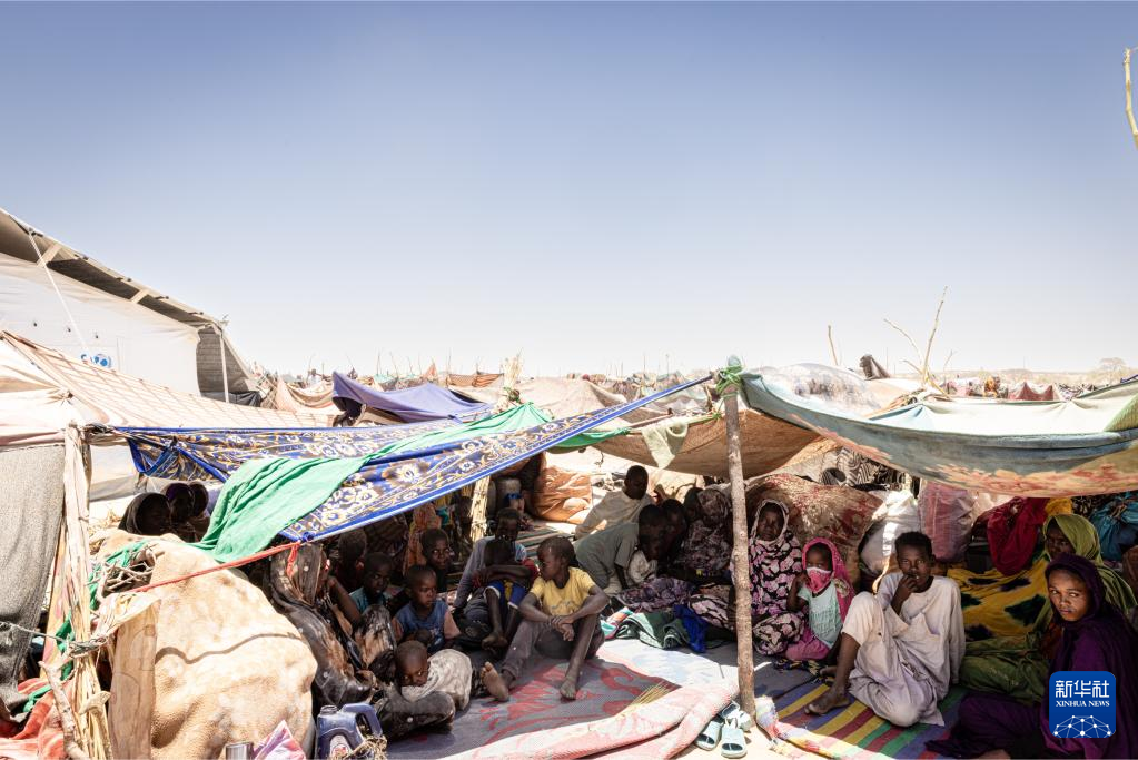 8月8日,在苏丹北达尔富尔州塔维拉镇,流离失所的妇女和孩子坐在用树枝和破布搭建的简陋帐篷下。新华社发(世界粮食计划署供图)