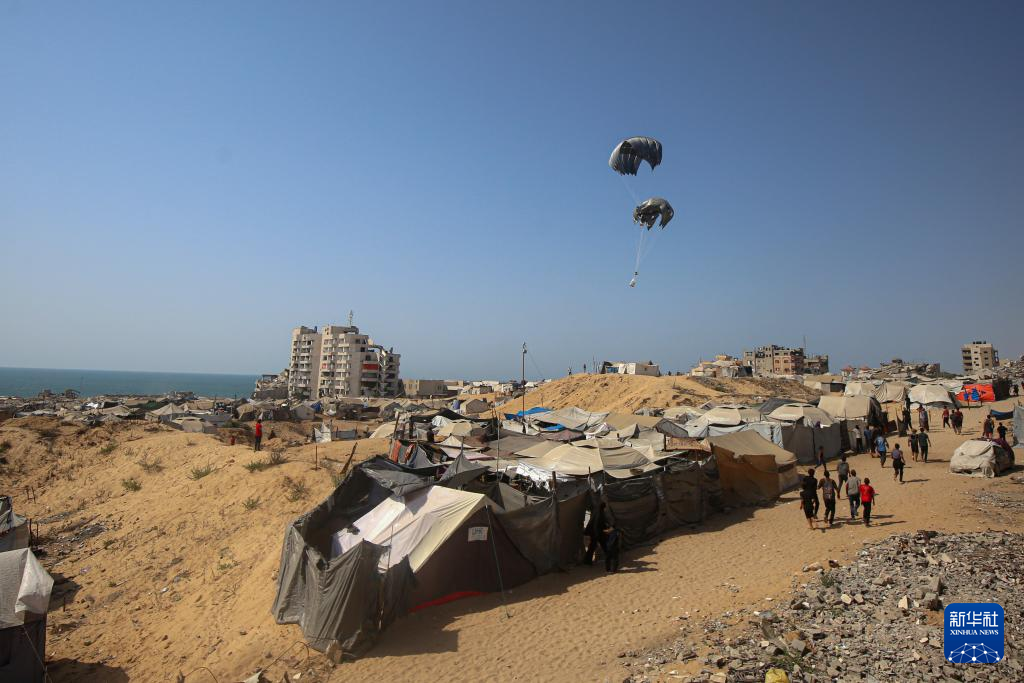 这是8月15日拍摄的加沙城上空的空投物资。新华社发(里泽克·阿卜杜勒贾瓦德摄)