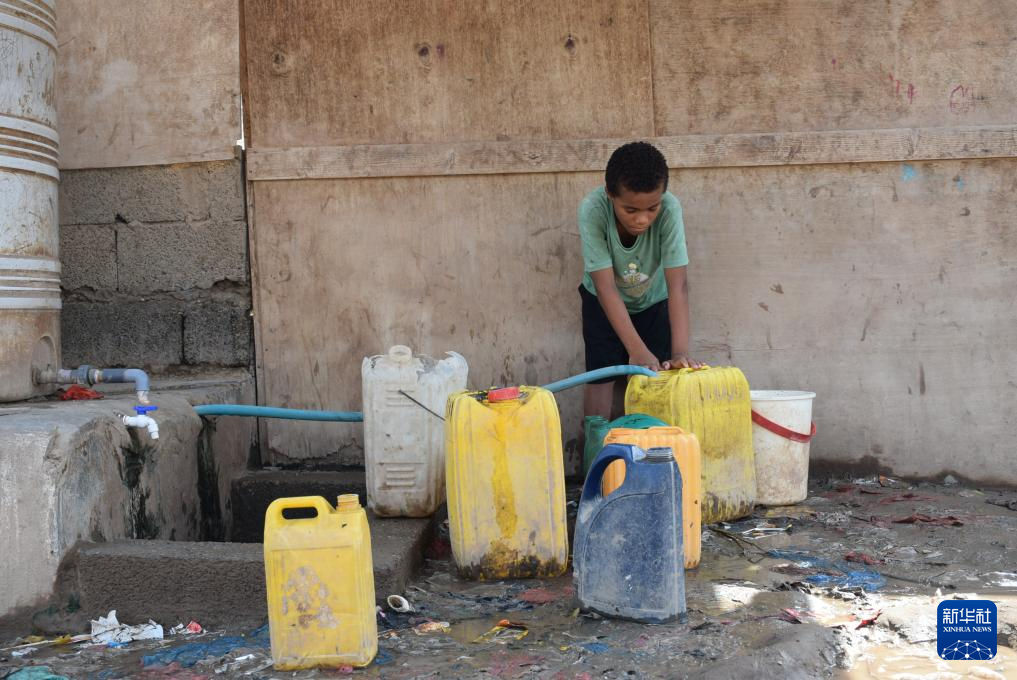8月11日,在也门亚丁郊区的一个流离失所者临时安置营地,一名男孩从水箱灌装饮用水。新华社发(穆拉德摄)