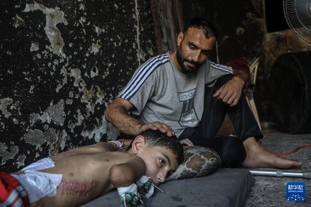 8月14日,萨米尔·扎库特和家人在加沙城的家中,11岁的巴勒斯坦儿童萨米尔·扎库特在以军空袭中失去了右臂和左腿,造成永久残疾。新华社发(里泽克·阿卜杜勒贾瓦德摄)