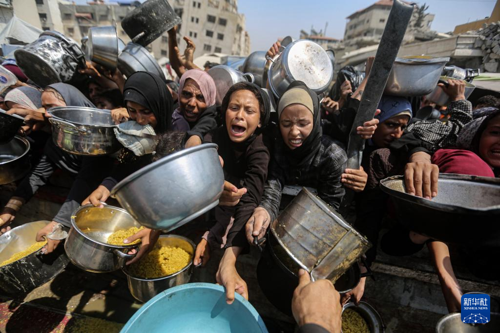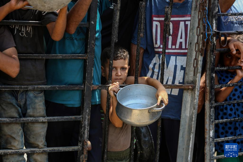 8月10日,流离失所的巴勒斯坦人在加沙城西部等待领取食物。新华社发(里泽克·阿卜杜勒贾瓦德摄)