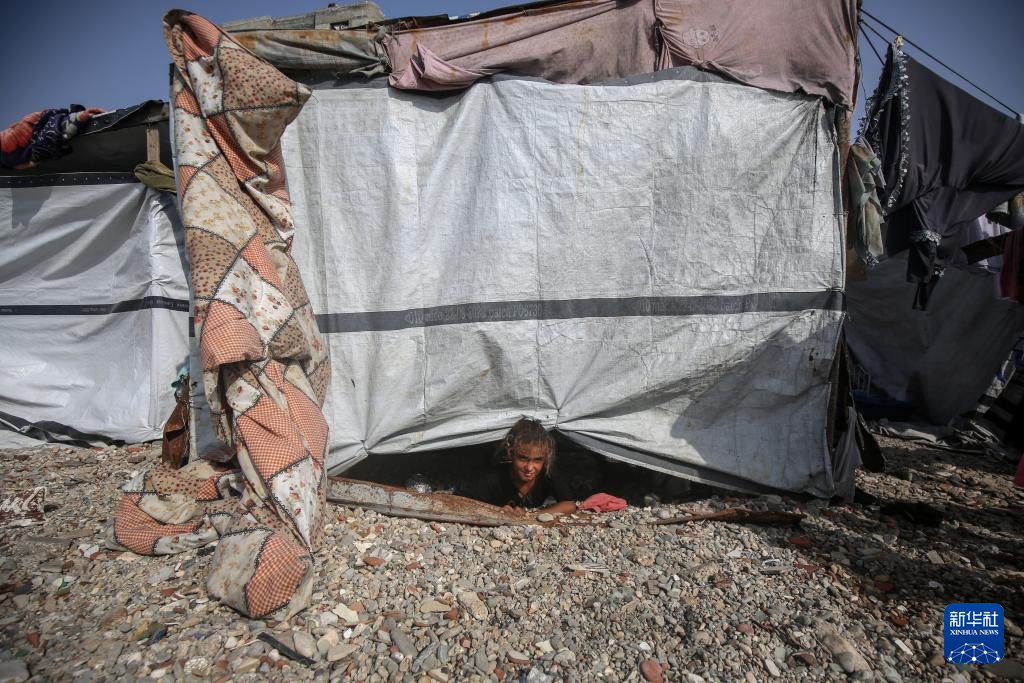 这是8月14日在加沙城的海边拍摄的流离失所的巴勒斯坦儿童。新华社发(里泽克·阿卜杜勒贾瓦德摄)
