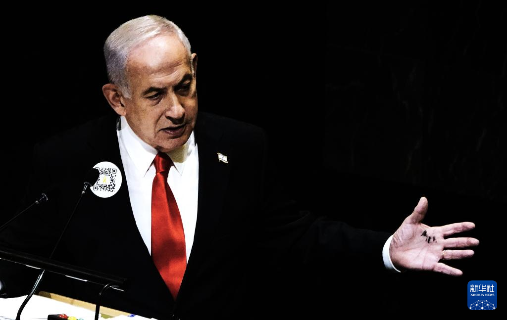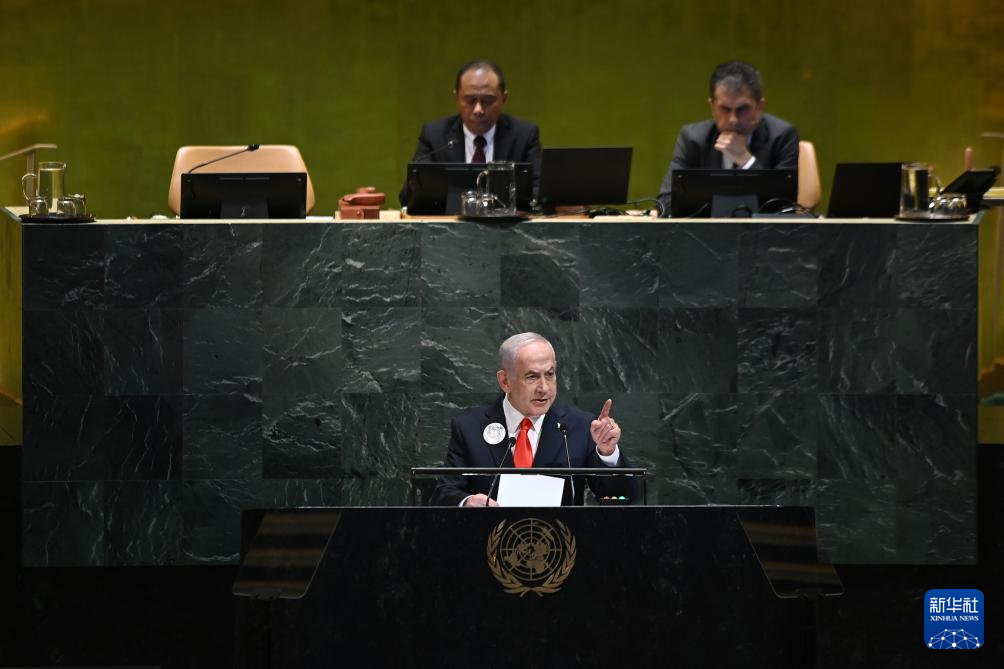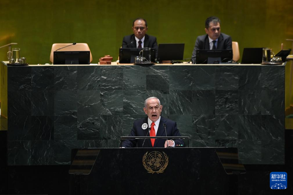9月26日,在位于纽约的联合国总部,以色列总理内塔尼亚胡在第80届联合国大会一般性辩论发言。众多联合国会员国代表起身离席,退场抗议。新华社记者吴晓凌摄